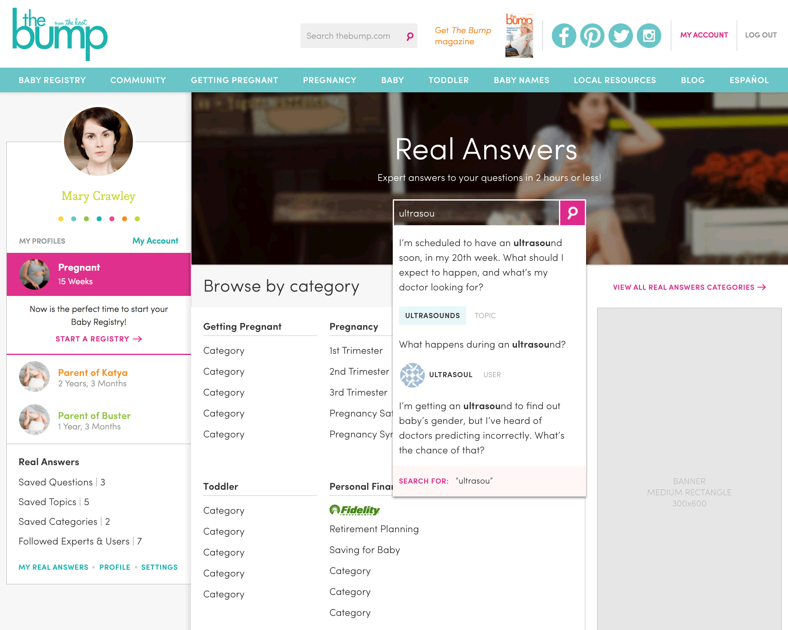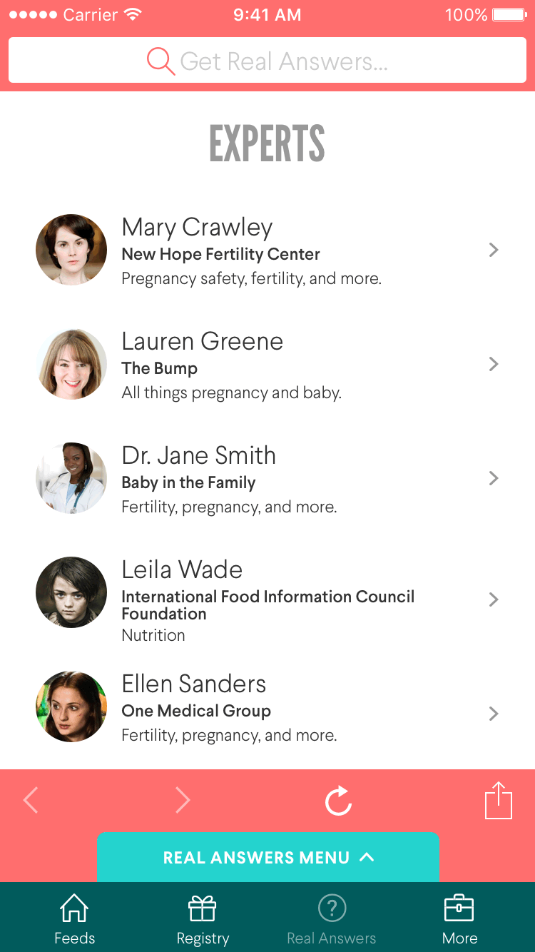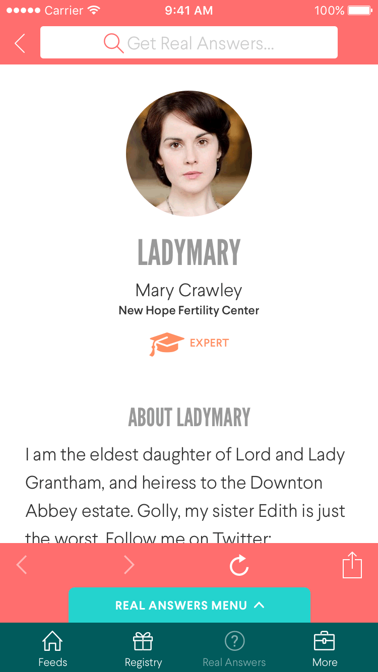UX design for a user-generated content questions & answers platform for people who are pregnant or trying to conceive. Below are several high-fidelity wireframes for mobile and desktop. You may notice I amused myself and my colleagues by using characters from Downton Abbey for placeholder user avatars.