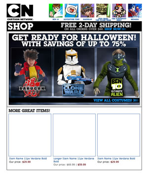 The preferred house style at the time was fully-designed graphical emails. These was extraordinarily difficult for me to design and code, especially considering the strict technical requirements of our email marketing partner. I unsuccessfully lobbied for us to create reusable templates, with a standardized graphical tout at the top, and 6 or 9 products below, in HTML text. I still think that would have been more efficient, appealing, and lucrative.
