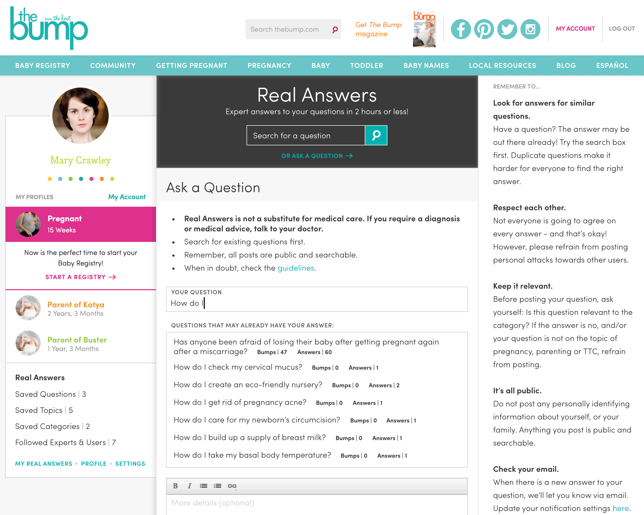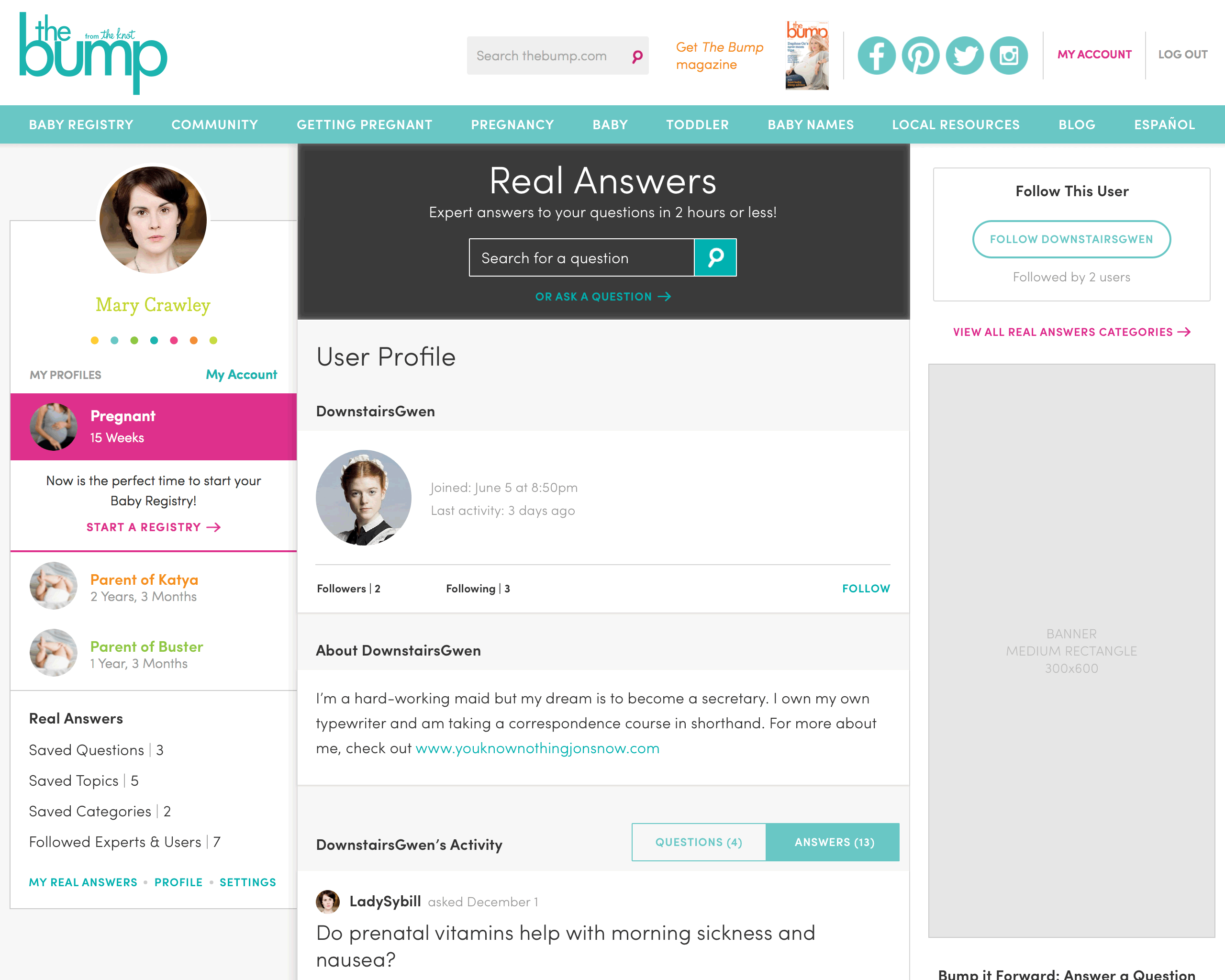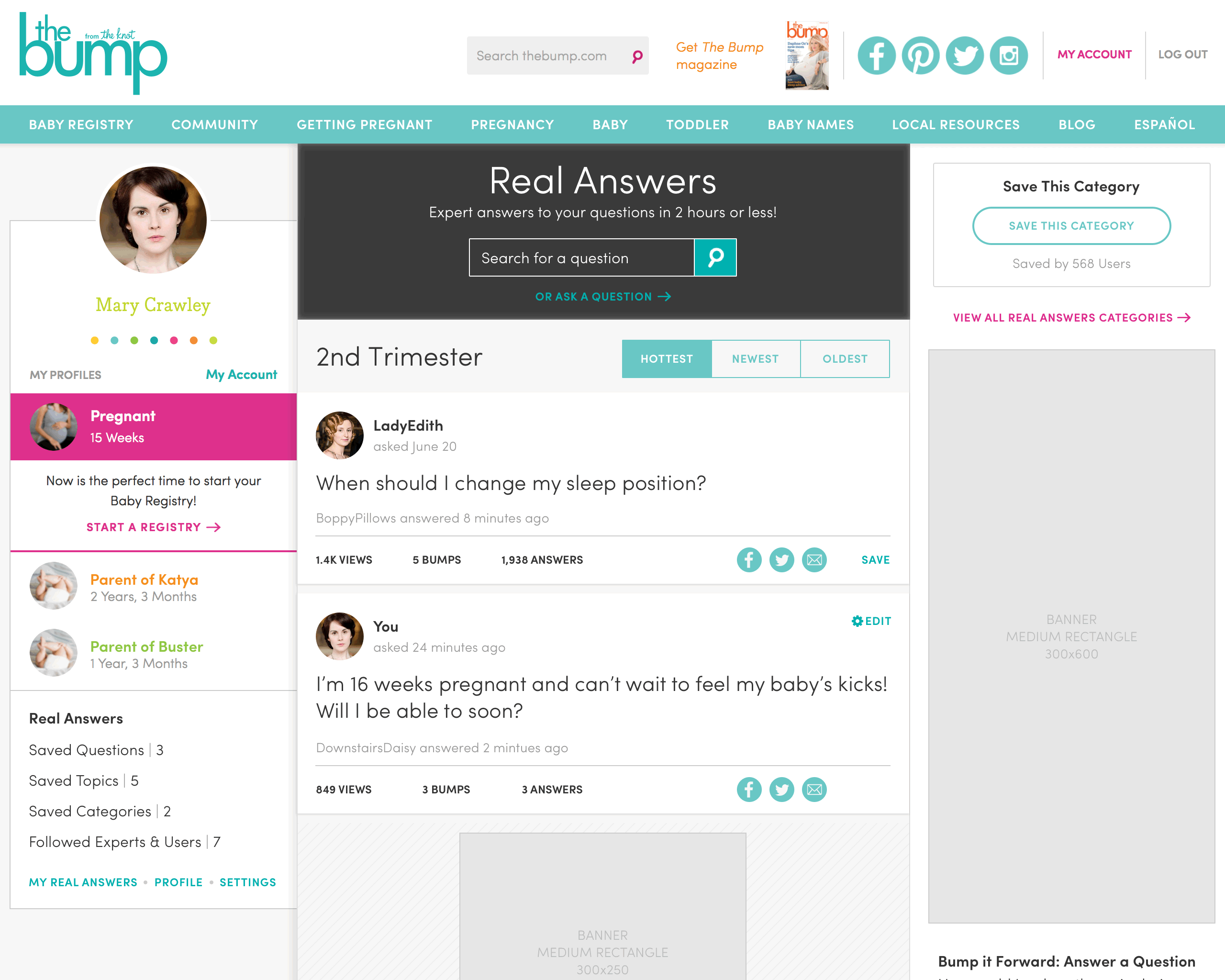 UX design for a user-generated content questions & answers platform for people who are pregnant or trying to conceive. Below are several high-fidelity wireframes for mobile and desktop. You may notice I amused myself and my colleagues by using characters from Downton Abbey for placeholder user avatars.